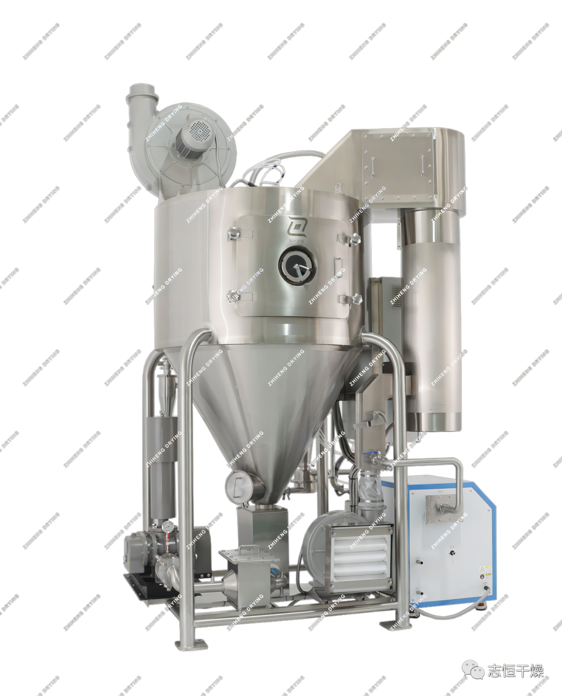 對微膠囊在傳統(tǒng)干燥工藝中存在的問題,志恒針對食品行業(yè)經(jīng)過改良研發(fā)的新型噴霧干燥機(jī),專門針對具有熱敏性強(qiáng)、干燥性差、軟化點(diǎn)低、吸濕性強(qiáng)等特點(diǎn)的物料改良開發(fā)的一款新型噴霧干燥機(jī)。作為溶劑蒸氣含量干燥生產(chǎn)中較為理想的新選擇。干燥室內(nèi)壁和塔頂設(shè)計(jì)為空氣冷卻夾套形式,可以降低內(nèi)壁的溫度,避免物料因接觸高溫壁面而焦化變質(zhì);該設(shè)備所有進(jìn)氣節(jié)點(diǎn)空氣采用H13過濾等級,符合GMP生產(chǎn)要求。